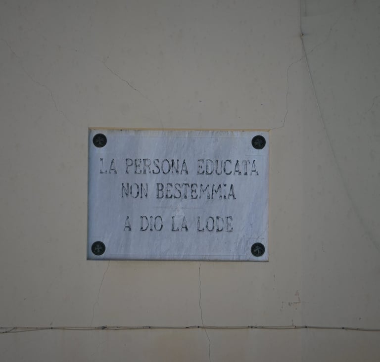 La terza peculiarità di questo paese, però, risiede in una singolare iniziativa le cui testimonianze sono ancora oggi visibili, in particolare nella piazza del piccolo abitato. È lì, proprio nel centro del paese, dove le quattro strade principali si incontrano, che sul muro di una casa antica, campeggia una targa: La persona educata non bestemmia/a Dio la lode.